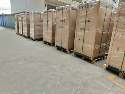 如上圖所示,英創(chuàng)思發(fā)貨的第一步,將做好后的充電柜平整擺放好并將其打包等待貨車到來。貨車到達(dá)后,將打包好后的充電柜用推車推入貨運(yùn)電梯,整個(gè)搬貨過程都是十分小心的,避免產(chǎn)品碰墻損壞。