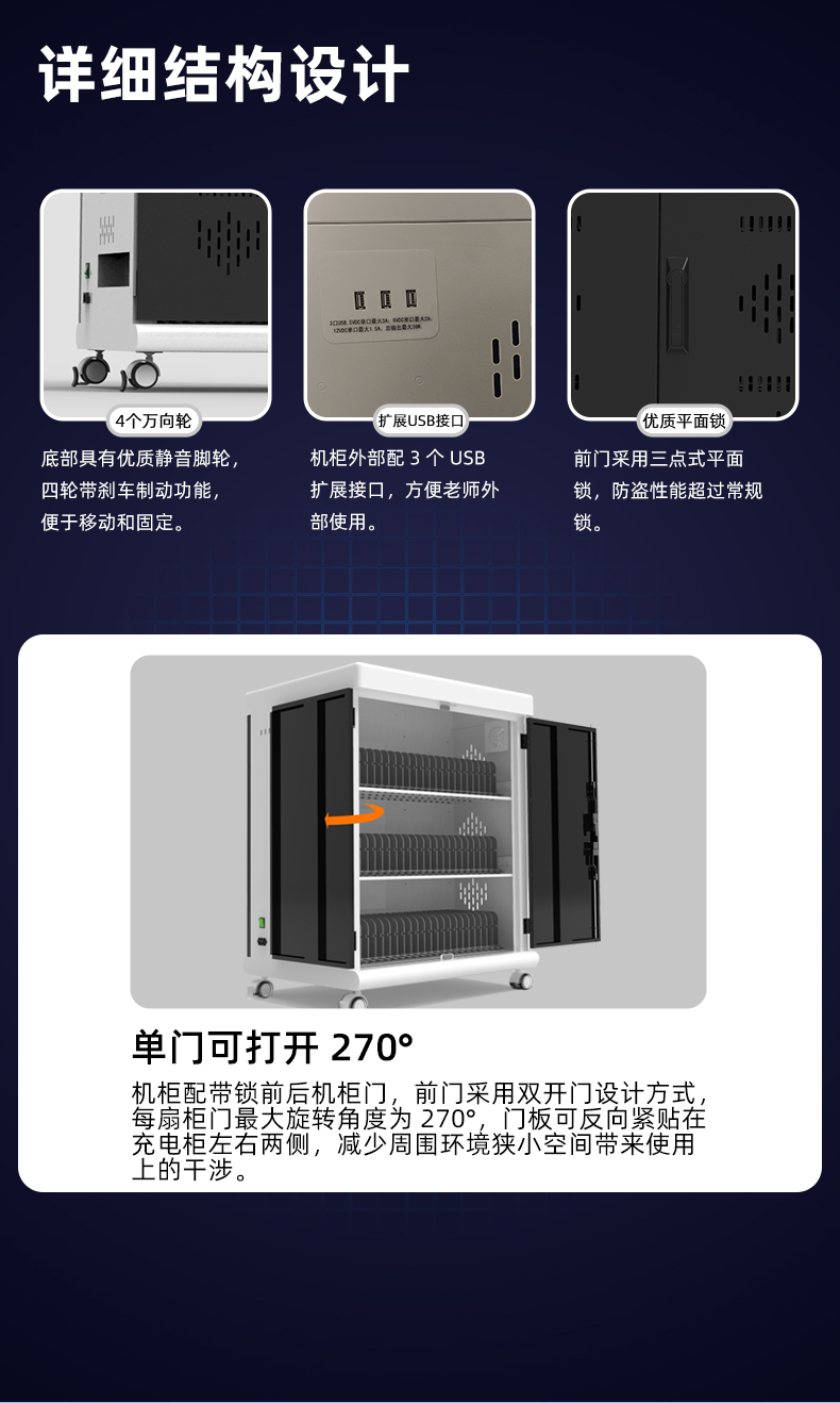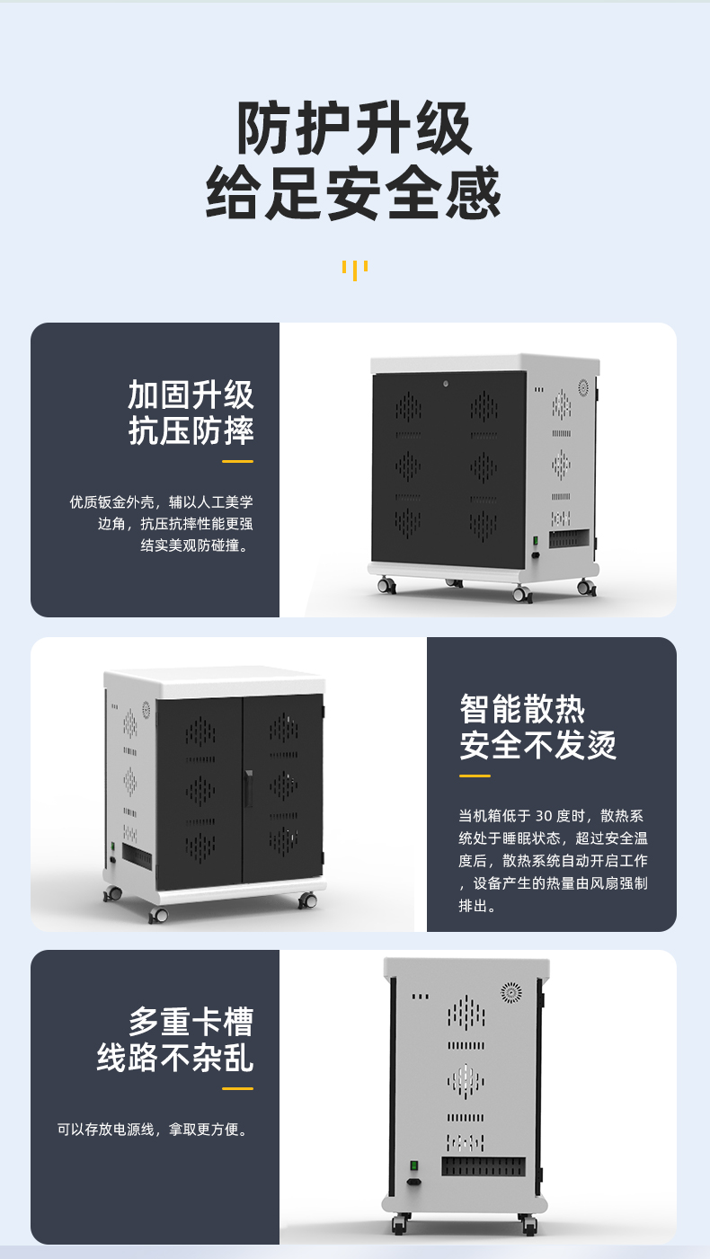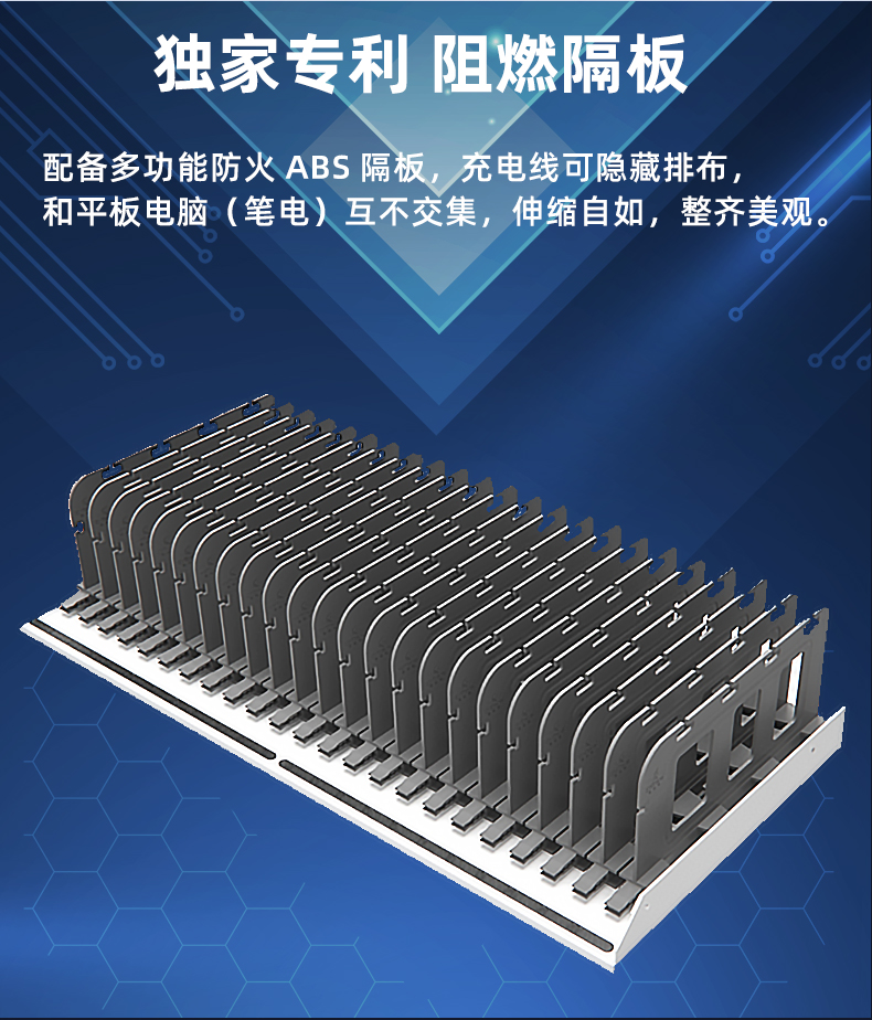 2.擺放整齊:配備多功能塑膠隔板,充電線可隱藏排布,充電線和平板電腦(筆電)互不交集,美觀方便,同時(shí)隔板上配有快捷卡位槽,隨用隨取?!铩?br />