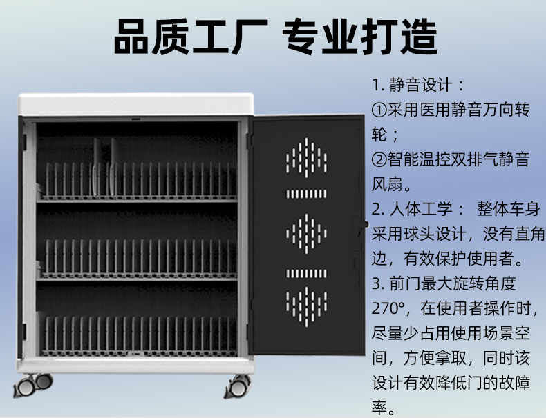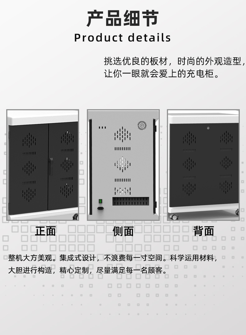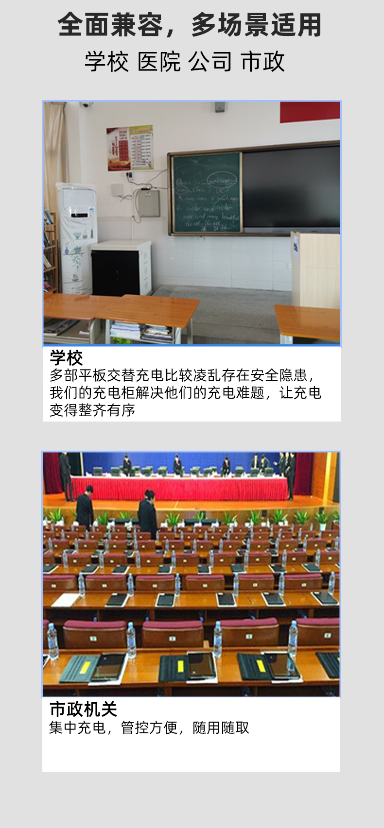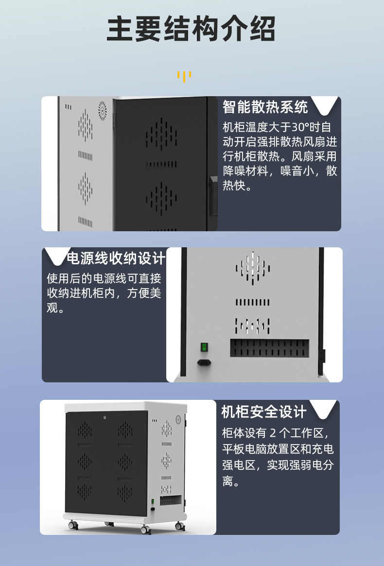 2.擺放整齊:配備多功能塑膠隔板,充電線可隱藏排布,充電線和平板電腦(筆電)互不交集,美觀方便,同時(shí)隔板上配有快捷卡位槽,隨用隨取?!铩?br />